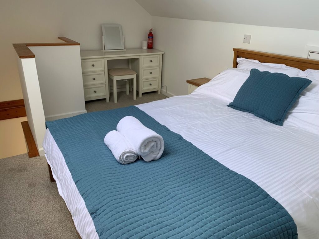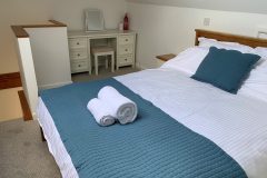 With reduced head height in the eaves, Kingsize bed, with Velux window looking over Perranuthnoe beach.